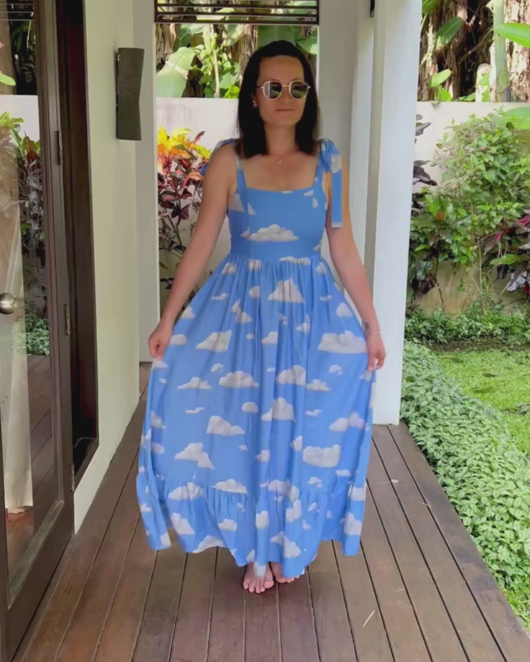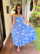 Hand drawn clouds dance across a soft sky blue canvas in a print created exclusively in-house to bring instant joy (and a few “where did you get that?” moments). Shoulder tie straps let you adjust the vibe - cute bow or dramatic knot, your choice - while princess seams subtly sculpt the bodice. The shirred back keeps things comfortable no matter how many twirls, toasts, or taxis you take.